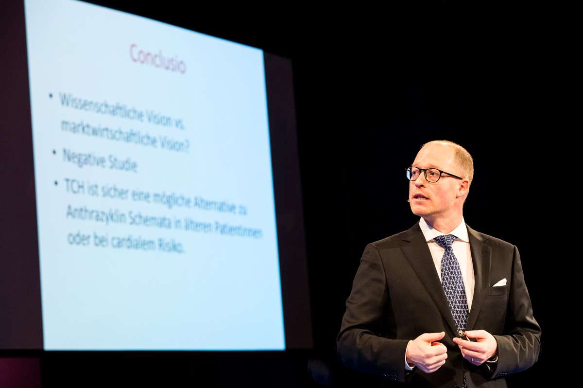 Den Abschluss des ersten Blocks der Rapporteure machte Ass.-Prof. Priv.-Doz. Dr. Rupert Bartsch mit dem Freitag Vormittag. Dieser wurde vom metastasierten Mammakarzinom sowie von neoadjuvanten und postneoadjuvanten Therapieschemata bestimmt. Wie auch alle anderen Rapporteure davor, gestaltete Prof. Bartsch seinen Vortrag konzentriert und übersichtlich. Bei der postneoadjuvanten Therapie ist die Prognose bei PatientInnen ohne pCR nach neoadjuvanter Chemotherapie problematisch, klar evident hingegen bei aggressiven Subtypen und auch bei entsprechend großer Population von luminalen Tumoren. Es gibt derzeit keinen klar definierten Standard zur postneoadjuvanten Behandlung.
