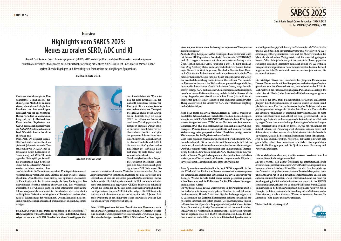 In der aktuellen Ausgabe 01/2026 des krebs:hilfe!-Magazins spricht ABCSG-Präsident Michael Gnant über die zentralen wissenschaftlichen Erkenntnisse des San Antonio Breast Cancer Symposium 2025. Im Interview beleuchtet er die aus seiner Sicht wichtigsten Entwicklungen aus der internationalen Brustkrebsforschung und ordnet deren klinische Relevanz ein.