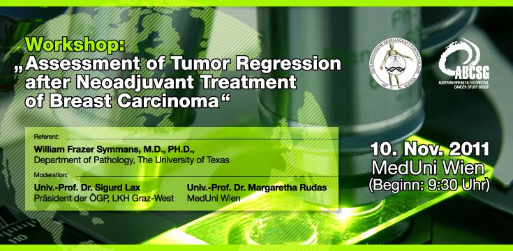 Erstmals veranstaltet die Österreichische Gesellschaft für Pathologie/IAP Austria gemeinsam mit der Austrian Breast & Colorectal Cancer Study Group (ABCSG) einen Workshop mit hochkarätiger Besetzung. Prof. William Fraser Symmans kommt nach Österreich und wird theoretische und praktische Aspekte der Regressionsbeurteilung von Mammakarzinomen nach neoadjuvanter Therapie behandeln und im Speziellen Kenntnisse und Fertigkeiten seines entwickelten RCB (Residual Cancer Burden) Gradingsystems vermitteln.